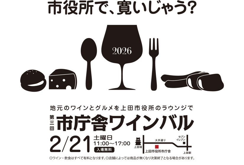2/21(土)上田市役所ラウンジで『第3回 市庁舎ワインバル』開催!一日限定のワインバルで地元ワイン・グルメを楽しんで@長野県上田市