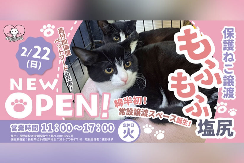 2/22(日)オープン!保護猫の譲渡施設「もふもふ塩尻」里親希望者をつなぐ新たな出会いの場が「綿半スーパーセンター 塩尻店」内に登場!ペットフード売場もリニューアル@長野県塩尻市