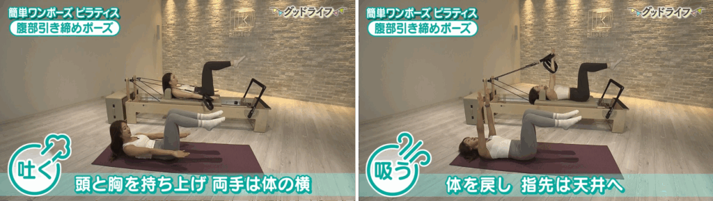 余裕がある方は片足を持ち上げるチャレンジポーズを。より負荷がかかるので引き締まった下腹部を手に入れることができます!