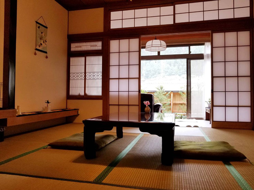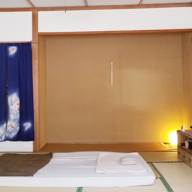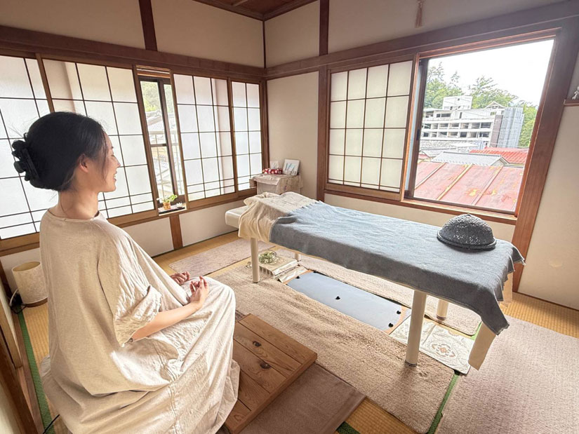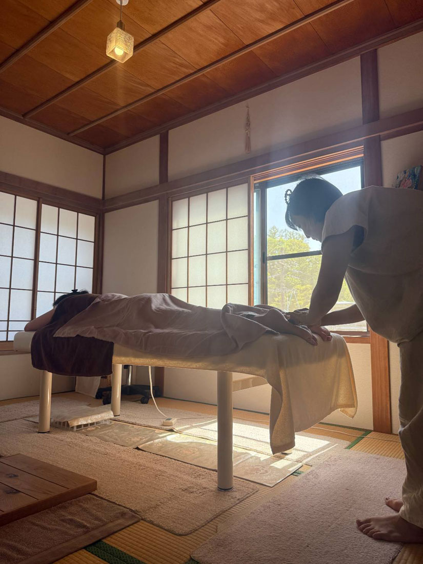 マットレスが敷かれた畳敷きのトリートメントルームは、窓を開け放つと風が通り抜ける開放的な空間。自然の気配を感じながら施術を受けられます。壁には麻炭漆喰を施工し、床下には麻炭サークルを取り入れるなど、空間づくりにも細やかなこだわりが感じられます。