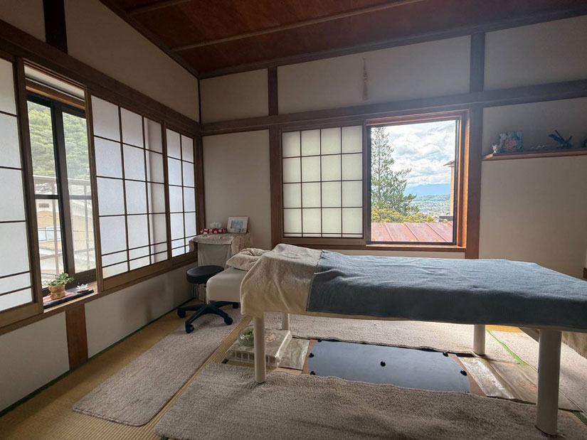 「詩おり」の特徴は、その空間の心地よさにあります。浅間温泉の奥まった場所に佇む一軒家。清々しい和室に、木の梁と格子窓から差し込む柔らかな光。施術用ベッドも天然素材でそろえられており、和の雰囲気に溶け込むよう、シンプルかつ温かみのある色合いで整えられています。
