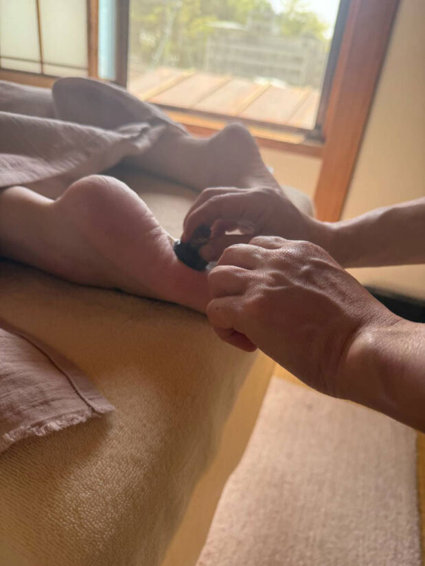 寒い季節に人気のメニューが「チベット温熱オイルセラピー」。高橋さんは岐阜のクリニックや京都で学んだチベット伝統医学をベースに、独自のセラピーを提供しています。