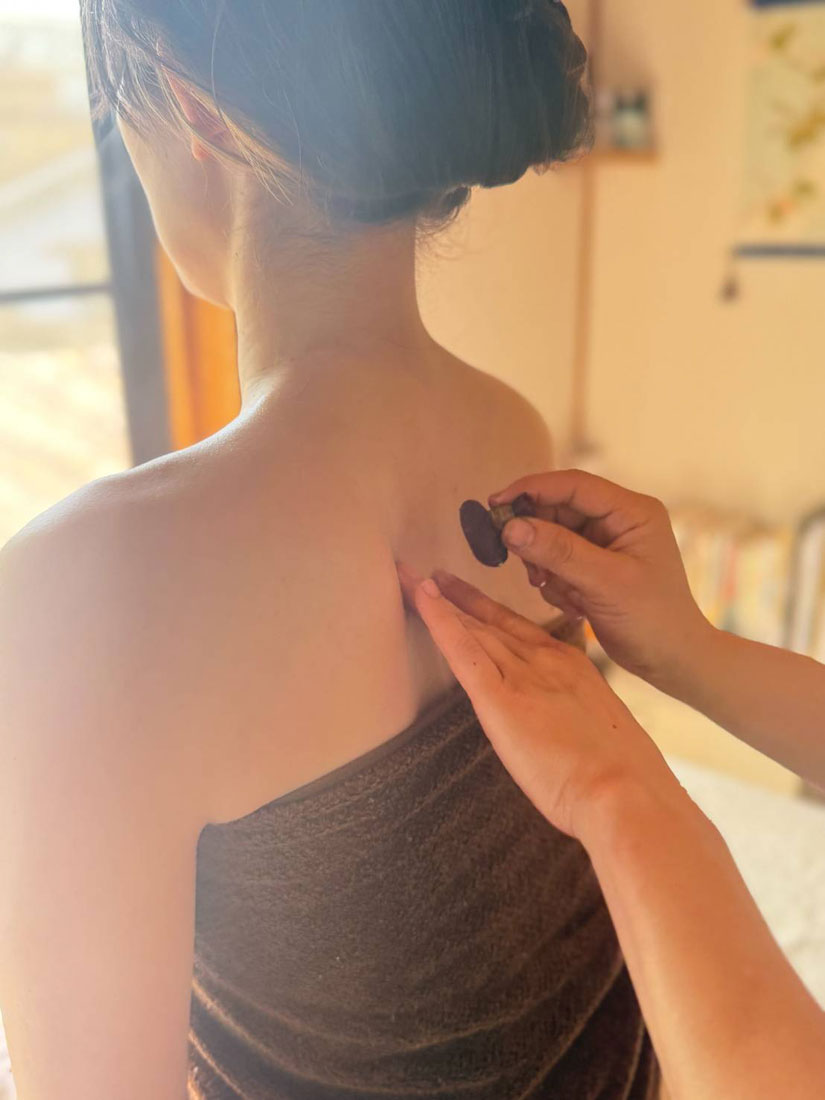 「このセラピーは、温めたオイルや生姜やシナモンなどのスパイスを使い、体のツボに熱を入れて身体を緩めていきます。エネルギーを整え、心のケアにもつながります」。