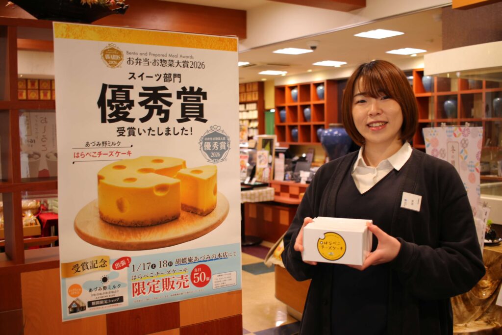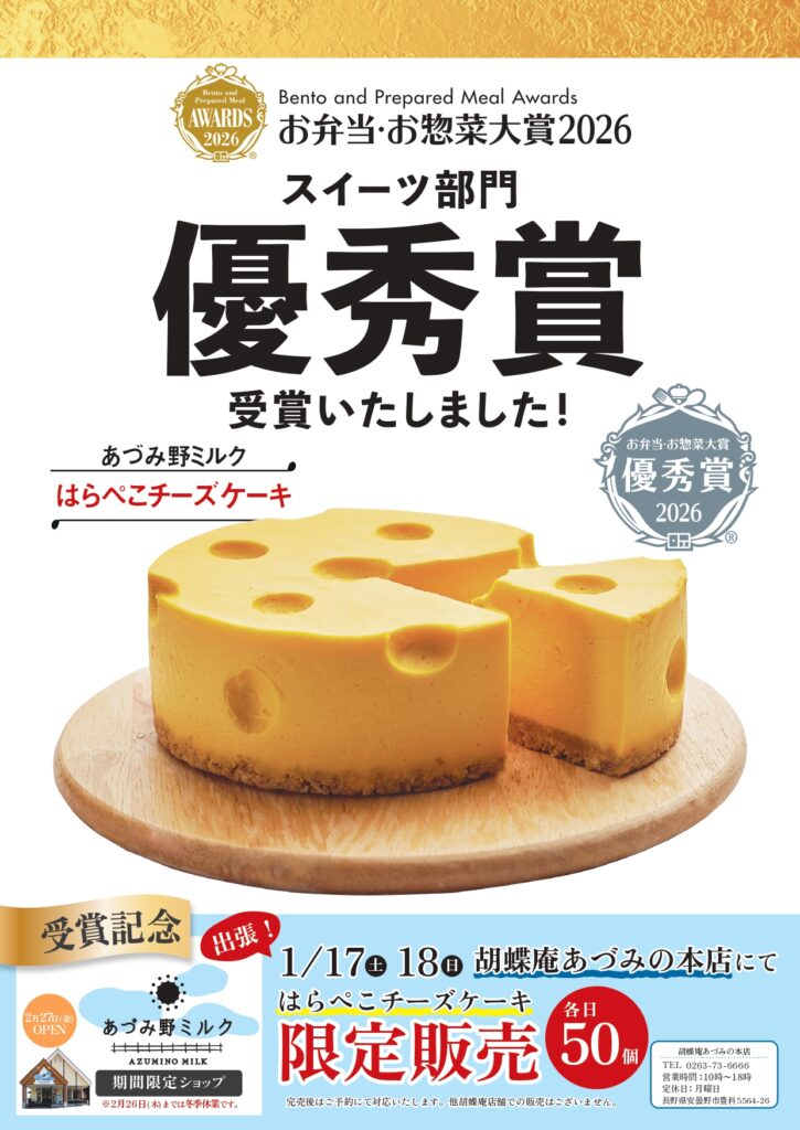 今回の受賞を記念して1月17日と18日の2日間、「あづみの茶 胡蝶庵 あづみの本店」で限定販売イベントが開催されます。『はらぺこチーズケーキ』を販売するあづみ野ミルクは通常、夏季限定(3月〜10月)での営業のため、今回の販売は受賞したスイーツをお店でいち早く手に入れるチャンス!各日50個限定で、価格は2,139円(税込)です。