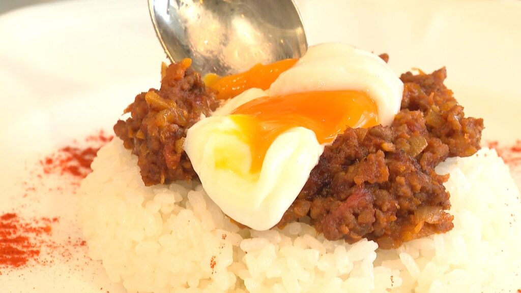 カレーはスパイシーですが、トマトの酸味・風味が効いています。卵の黄身を絡めれば、スパイスの角が取れて、まろやかな味わいに。
