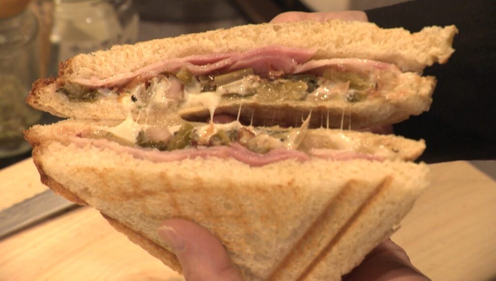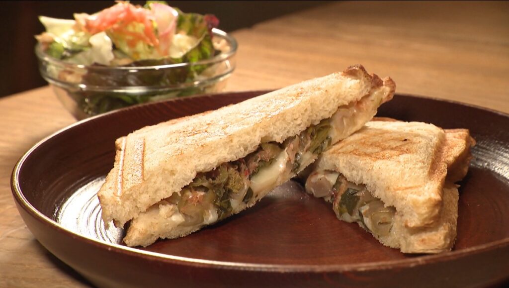 続いて登場したのは、「すんき」と、たっぷりのおかかを醤油味でまとめた和風のホットサンド。アクセントで七味唐辛子も入っています。
