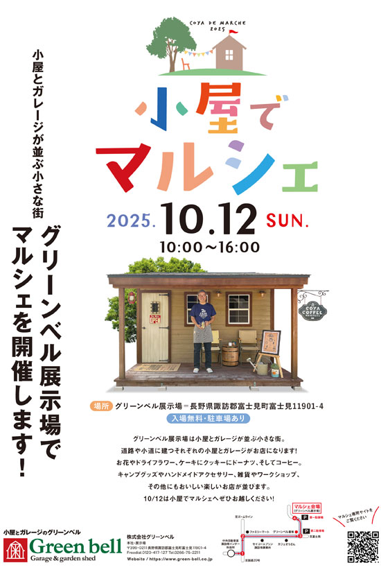 八ヶ岳の麓、長野県諏訪郡富士見町にあるグリーンベル本社展示場で、2025年10月12日(日)に「小屋でマルシェ」が開催されます。可愛くておしゃれなデザインの小屋とガレージが軒を連ねるこの場所が、一日限りの特別なマルシェに変身します。