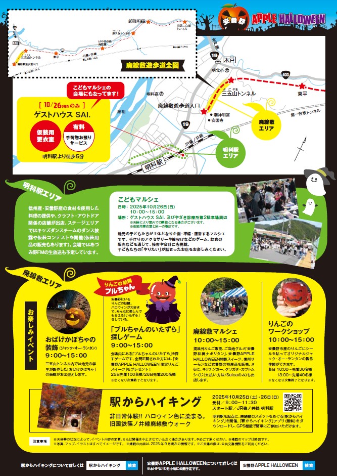 旧篠ノ井線の「廃線敷エリア」と「明科駅エリア」で開催されるハロウィンイベント。「廃線敷エリア」(25・26日/9:00~15:00)では、三五山トンネル内におばけかぼちゃの装飾(ジャック・オー・ランタン)、『プルちゃんのいたずら』探しゲーム、廃線敷マルシェ/ワークショップなど。廃線敷を歩くウィーキングイベントもあります。「明科駅エリア」(10月26日/10:00~16:00)では仮装コンテストを開催! ワークショップ、キッチンカーも出店します。