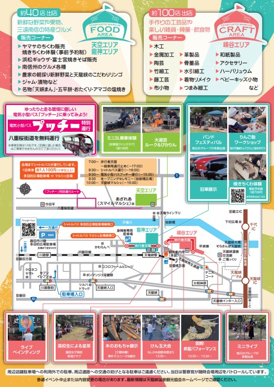 天龍峡公園周辺で開催される、食べて・見て・体験して、天龍峡を楽しむイベントです。キッチンカー&屋台グルメ、クラフト作家の手作り雑貨、ワークショップ、旬の野菜・果物のファーマーズマーケット、さらに大道芸・バンドフェス・ライブ・けん玉大会・茶席と盛りだくさんの内容。1日中楽しめますね。