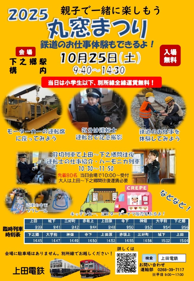 市民に親しまれた「丸窓電車」にちなむ上田電鉄のイベント。鉄道のお仕事体験、電車・モーターカー(線路作業列車)の運転席での記念撮影、キッチンカーなどの出店があります。鉄道好きは下之郷駅に集合! ※会場には駐車場がありません。パーク&ライド(大学前駅・中野駅・舞田駅)、別所線電車を利用してください。