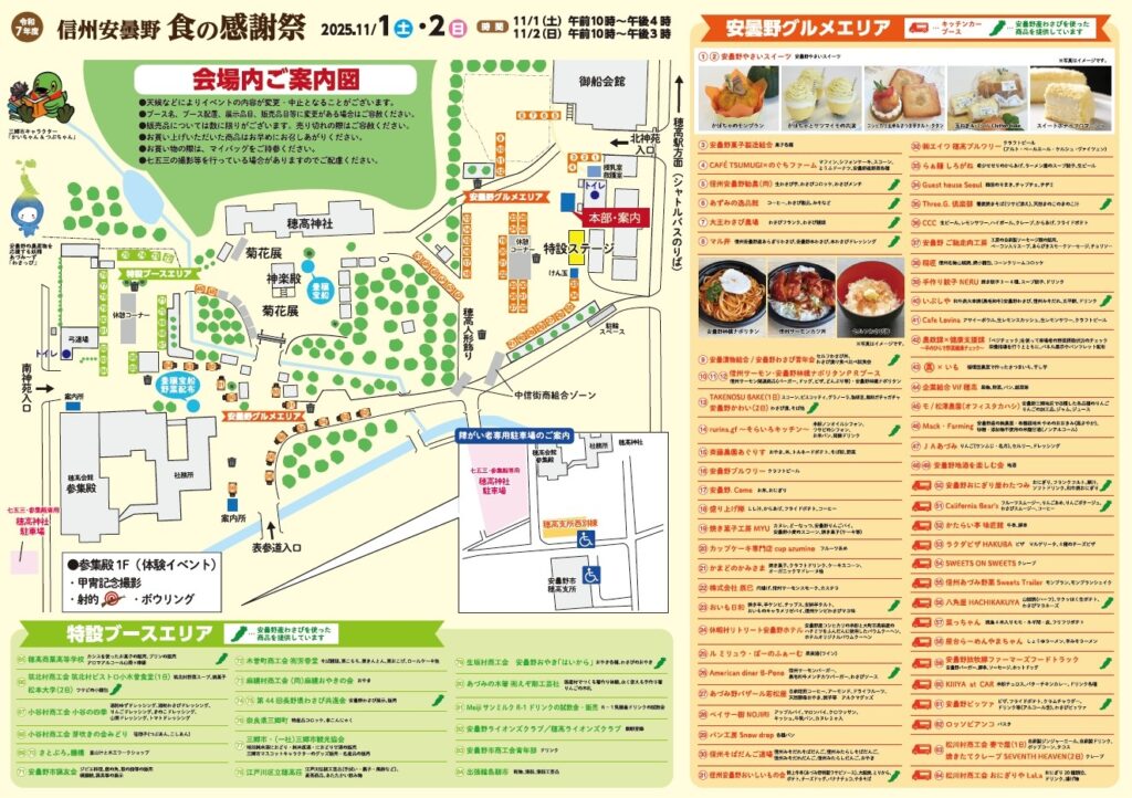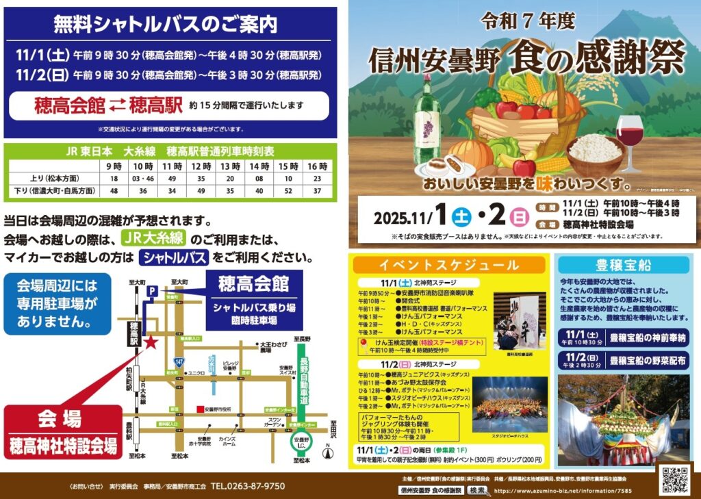 収穫の秋に感謝し、みんなで食を楽しむをイベントです。場所は穂高神社の特設会場。グルメエリアには「安曇野林檎ナポリタン」「信州サーモンカツ丼」「セルフわさび丼」などのご当地グルメ、地元の野菜を使ったスイーツなどのブースが並びます。さらにステージイベントも。無料シャトルバスが出ます。