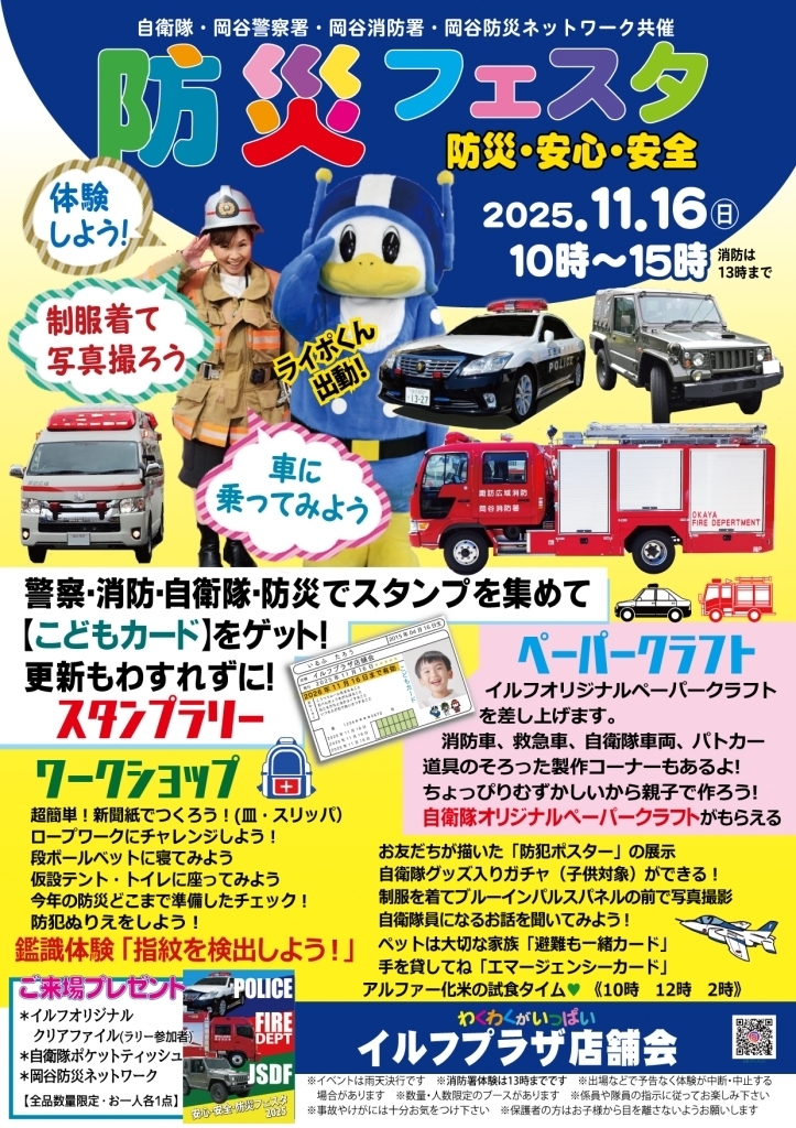警察、消防、自衛隊、防災の仕事を楽しく学んでもらうイベントです。各種車両の展示や制服を着ての記念写真、ワークショップなどが予定されています。各会場をめぐって、スタンプを集めると、こども免許カードがゲットできます!