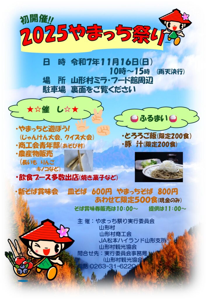 村をはじめとする関係団体が実行委を作って、山形村の魅力を発信するイベントを初めて開催します。長芋、リンゴなどの特産品が並ぶ他、村のイメージキャラクター・やまっちと触れ合えるイベントも。とろろご飯と豚汁のふるまい(限定200食)や「新そば賞味会」もありますよ!