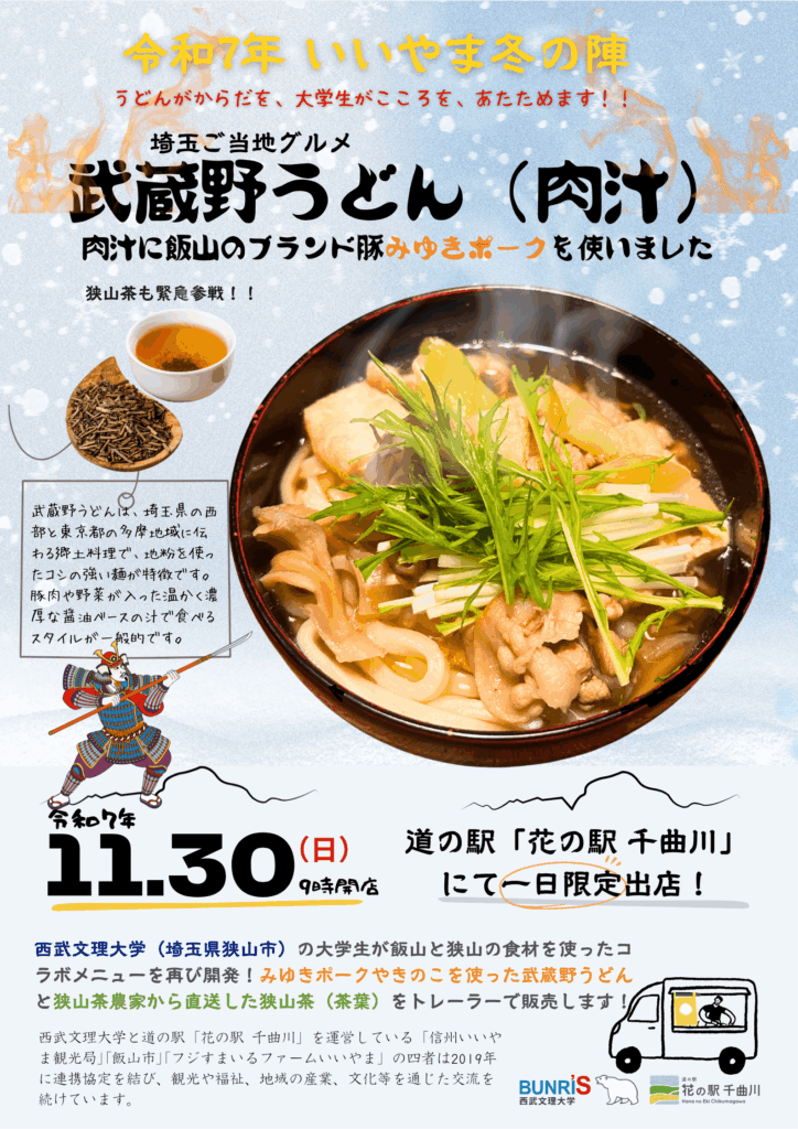 ■11/30(日) 『西武文理大学による「武蔵野うどん(肉汁)」「狭山茶」試飲・販売会』(飯山市)