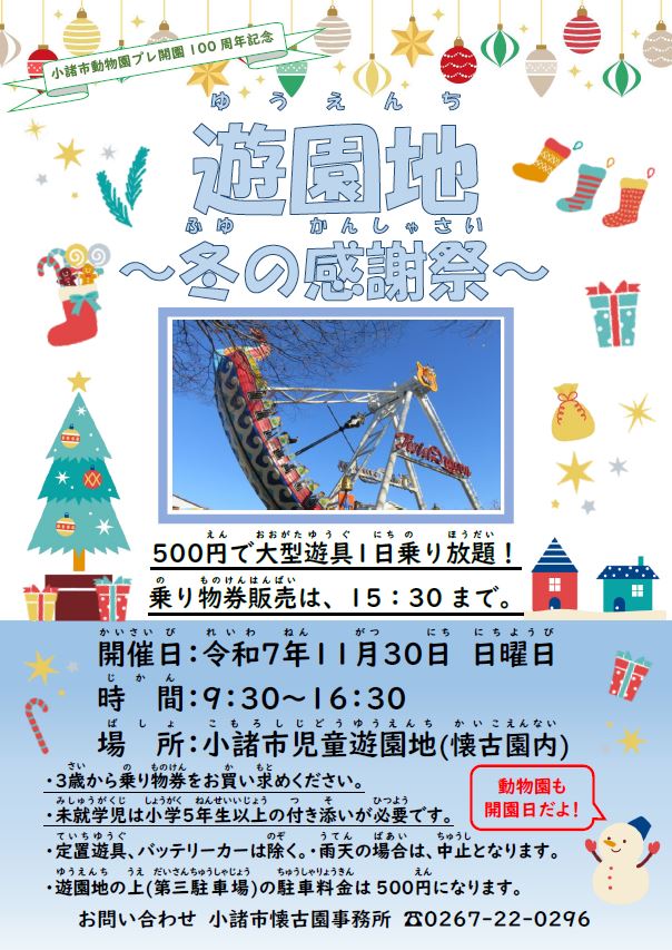 小諸市動物園プレ開園100周年記念として、小諸諸市児童遊園地で冬の感謝祭が開催されます。遊具1日乗り放題のパスポートが500円。当日は飲食の出店もあります。思うぞんぶん、遊んじゃおう!