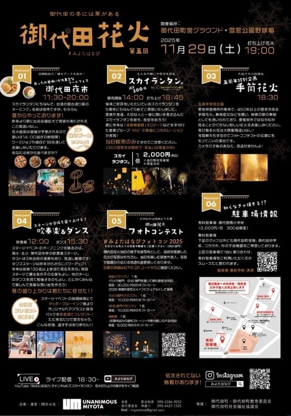 「地域を元気に!」と始まった花火の打ち上げ。記念すべき5回目の今回は迫力満点の「手筒花火」、願いを込めて空へ放つ「スカイランタン」が登場!日中からあったかグルメが楽しめる「御代田夜市」も。さらに「ダンスステージ」「フォトコンテスト」と多彩です。冬の花火って、きれいですよね。寒さ対策をして楽しみましょう!