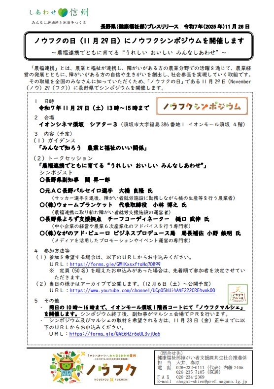 「農福連携」は、障がいのある人たちが農業に携わることを通じて、収入の確保や生きがいの創出、農業の人手不足解消につなげようという取り組み。この意義を知ってもらおうとトークセッション(先着50名まで)が開催される他、マルシェも同時開催。「ノウフク」の農産物や加工品が販売されます。シンポジウムの会場はイオンモール須坂内のイオンシネマ須坂シアター3、マルシェはイオンモール須坂1階西コートです。