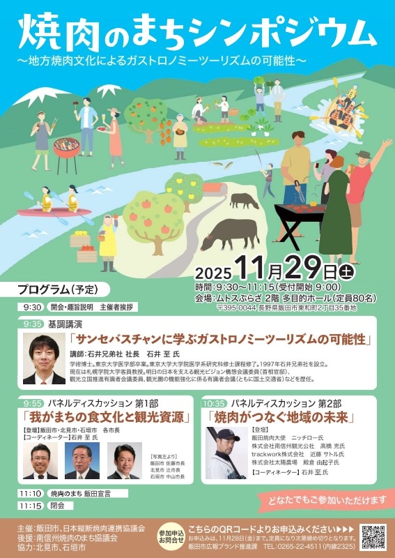 人口1万人あたりの焼肉店舗数日本一の飯田市。11月29日を「いい(11)にく(29)」で「飯田焼肉の日」、11月を「飯田焼肉月間」として地元の食文化をPRしています。今年度も30日まで「クイズラリー飯田焼肉検定」などを実施中です。29日には「月間」の締め括りともいえる「シンポジウム」を開催。基調講演に続くパネルディスカッション1部では、焼肉文化を発信する飯田市、北見市、石垣市の各市長が一堂に会します。2部では飯田焼肉大使のニッチローさんも登壇。「月間」のポスター、秀逸ですよね。