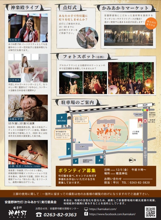 穂高神社の境内を約1万本の竹灯籠のあかりで彩る「神竹灯(かみあかり)」。いよいよ終盤の2日間を迎えます。午後4時からの点灯式は誰でも参加可能。飲食やクラフトのブースが出店する「かみあかりマーケット」、音楽で盛り上げる『神楽殿ライブ』もあります。