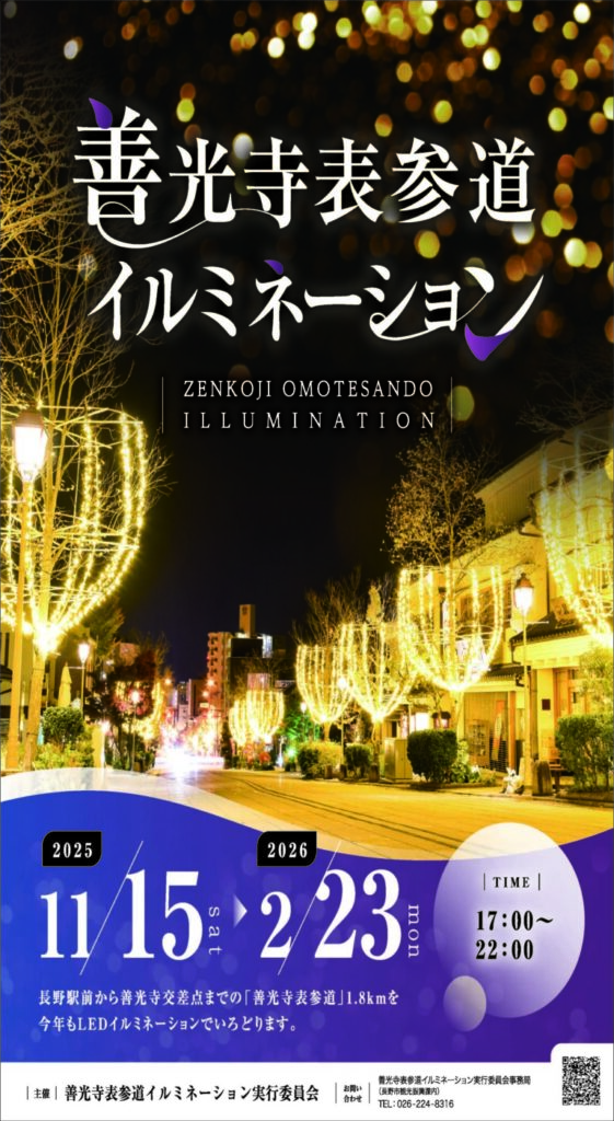 長野駅前から善光寺へと続く表参道が、約1.8㎞にわたって光に彩られています。2月にはおなじみとなった「長野灯明まつり」も。華やかな冬の表参道を楽しみましょう!