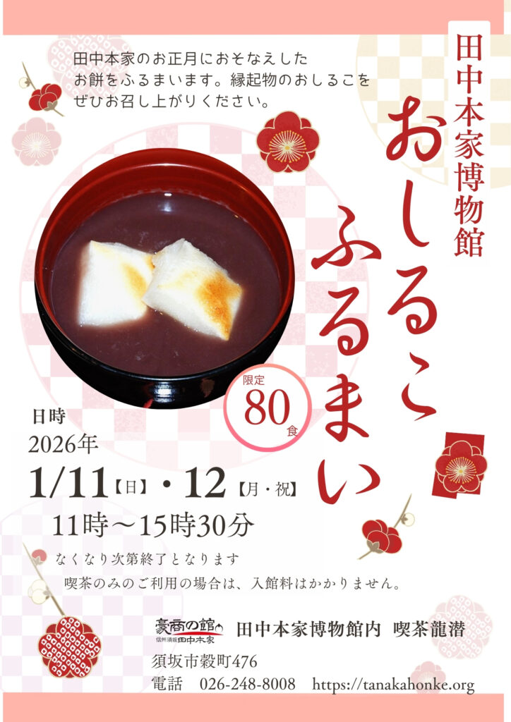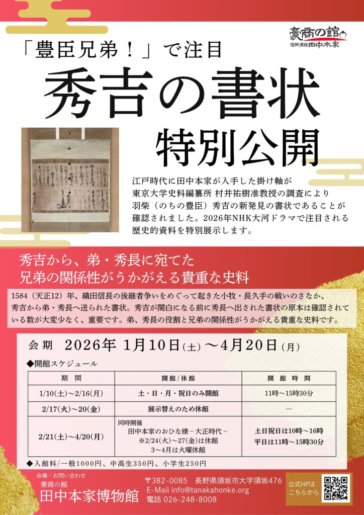 ■1/10(土)~4/20(月) 豪商の館 田中本家博物館『秀吉の書状 特別公開』、1/11(日)・12(月・祝)『おしるこ ふるまい』(須坂市)
