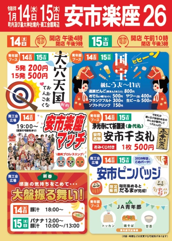 「週末イベント」ではありませんが、多くの人で賑わう伝統の市を紹介します。五穀豊穣・商売繁盛を願う行事で、長野県下の三大市の1つに数えられています。皇大神社では「だるまお焚き上げ」や「火渡りの神事」があり、境内には福だるまや縁起物の市が立ちます。商工会館周辺などでは関連イベントの「安市楽座」。豚汁のふるまいや信州プロレスの特別マッチと盛りだくさんです!