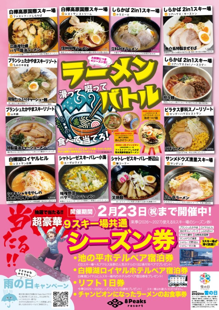 八ヶ岳山麓の9つのスキー場で構成される「8Peaks Resort」で、現在「ラーメンバトル」が開催中です。好評につき、4シーズン目の開催で、今シーズンは7施設・12品のラーメンがエントリー。指定メニューを食べると応募用QRコードがもらえ、投票・応募した方に抽選で「9スキー場共通シーズン券」や「ホテル宿泊券」などが当たります。期間は2/23(月・祝)まで。滑って、すすって食べて、豪華賞品を当てよう!