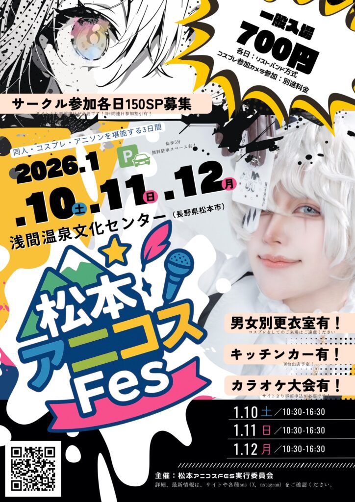 松本で初めて開催されるアニメ・コスプレ・アニソン・同人の祭典です。コンセプトは「こにいるみんなが主人公!」。コスプレイヤーも、サークル参加者も、一般参加者も「主役」です。同人誌・創作グッズの即売会、コスプレカラオケ大会、キッチンカーによる飲食エリアも。「あめ市」に負けない盛り上がりになりそう⁉