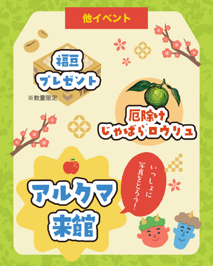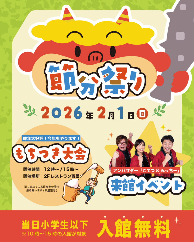 温泉施設のうるおい館で節分イベントが開催されます。好評のもちつき大会は正午と午後3時の2回で、つきたてのお餅が振舞われます(数量限定)。アンバサダーの「こてつ&みっちー」、県のPRキャラクター「アルクマ」も来館します。当日、小学生以下は入館無料! 親子で楽しめますね。