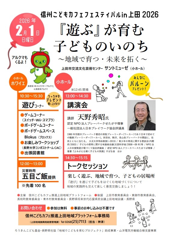 学習支援や食事提供などを通じて、子どもの居場所づくりに取り組む「信州こどもカフェ」のイベント。テーマは 『遊ぶ』が育む子どものいのち~地域で育つ・未来を拓く~」です。遊びコーナーでは、スイッチなどのゲーム、ボードゲーム、長野大学コンポストチームCACによる「お楽しみワークショップ」が楽しめます。「災害時用の五目ご飯」の提供は正午から先着100人に。参加無料・事前申し込み不要です。午後には講演会、トークセッションがあります。
