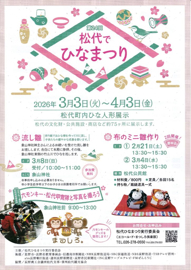 期間中、松代の文化財・公共施設・商店など約75ヶ所にひな人形が飾られ、様々な催しも行われます。8日午前10時からは、折り紙でおひな様を作って川に流し、子供たちの健やかな成長を願う「流し雛」のイベント。場所は象山神社です。ご当地キャラクターの六モンキー、松代甲冑隊との写真撮影も。六モンキーのグッズを販売します!