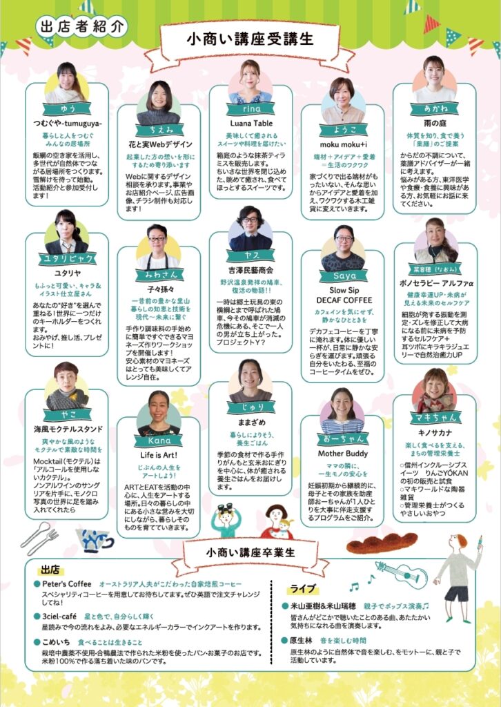 自分の「好きなこと」を起点に、仲間と共に「等身大のビジネス」を生み出そうという「小商い講座」。その受講生を中心に、卒業生や地域の仲間たちが集結。美味しいフードやクラフトのマルシェ、心地よい音楽ステージも。受講生にとって、これが「最初の一歩」。新たな挑戦を応援しましょう! 場所はいいづなコネクトEASTです。