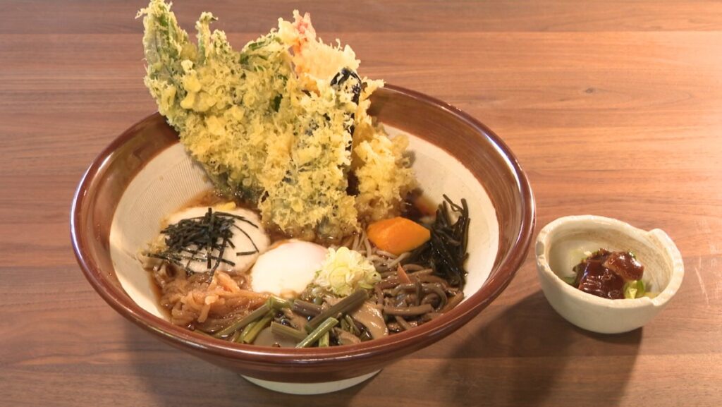 看板メニューは、器がすり鉢の「仁王様そば」。店主・横川幸喜さんが打ったそばの上には、エビやナスの大きな天ぷらが3つ。さらにとろろ、卵、山菜、切り干し大根などの具材がトッピングされています。「仁王様らしいメニューを」と考案したということで、その名にふさわしくボリューミーです。