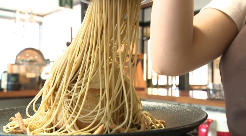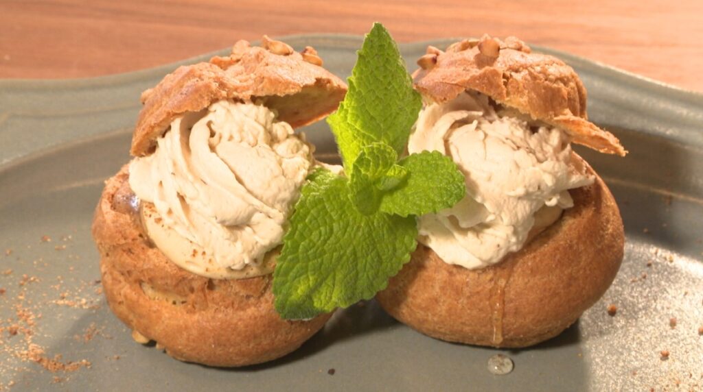 魅力はそれだけではありません。実は2階に『Cafe a-hum(あうん)』があり、妻・理恵さんが作る独創的なスイーツを味わえるんです。人気の「そばシュークリーム」は、そばを使った生クリームとカスタードクリームの2つの味が楽しめます。