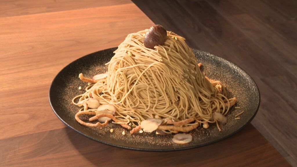 これからの季節におすすめなのが「戸隠そばモンブラン」。土台は、そばのシフォンケーキとそばのムースで、そこに小布施栗100%のペーストがたっぷりと絞られています。そばと栗、信州の秋を代表する「二大名物」が融合した贅沢なスイーツ。甘さ控えめの塩カスタードとコクのある栗のムースの組み合わせが絶妙です。下で「天ざる」を食べたあと、「モンブラン」をペロリ、という人もいるそうですよ。