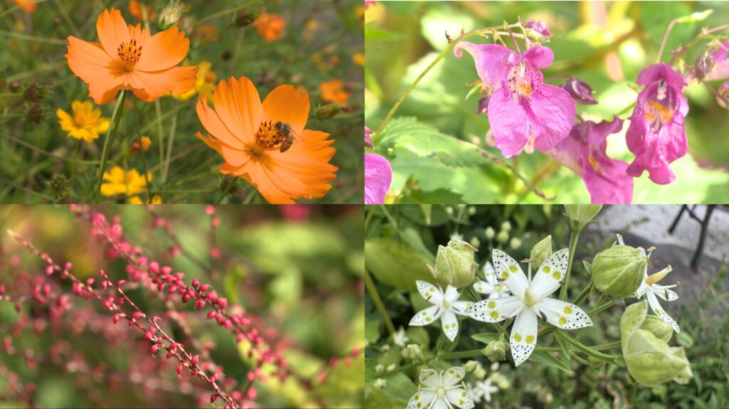 現在は秋の花が美しく咲き誇っています。つり舟のような形をした花が印象的な「ツリフネソウ」、その名の通り水引きのような赤い花が特徴的な「ミズヒキ」、模様がかわいらしい「アケボノソウ」など・・・。標高1000mにあるため、吹く風は涼しく、秋を先取りできる場所でもあります。
