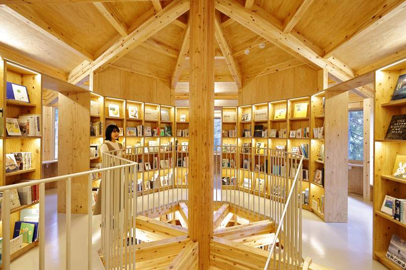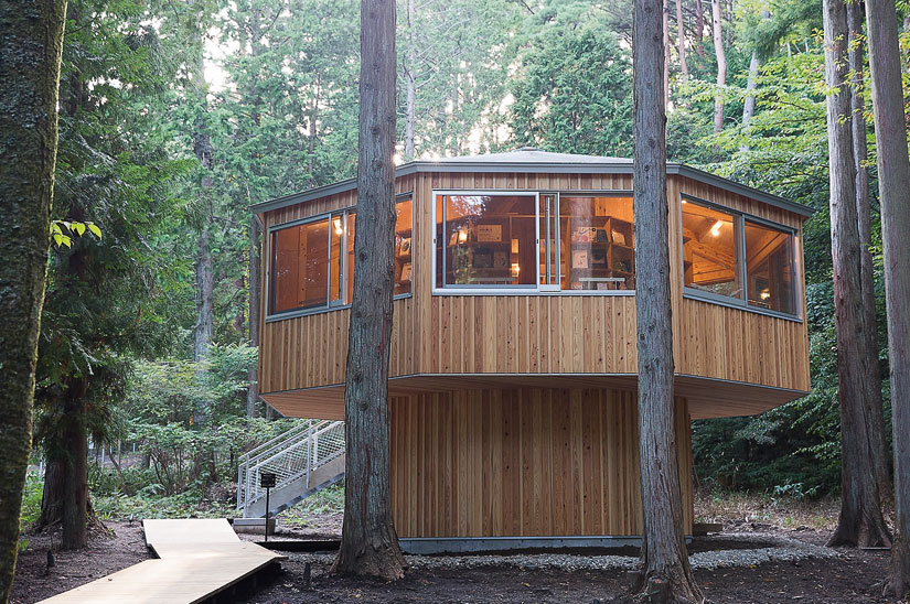 「森のライブラリー」は、自然の中に静かに佇むツリーハウスのような木造の建物。八角形の施設は、森に溶け込みながらも静かな存在感を放っています。