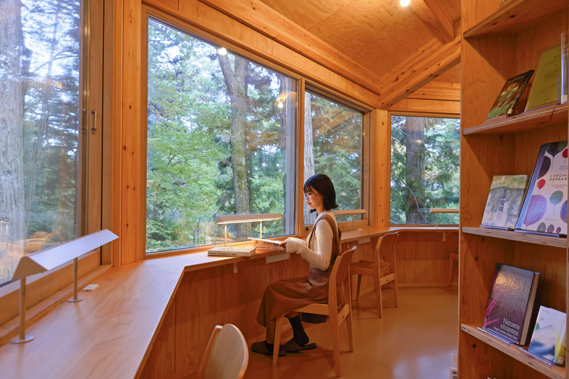 施設内には、9つのコンセプトに沿って厳選した本を所蔵。吹き抜けが特徴の建物内には約1,000冊の様々な書籍が並びます。窓際で自然を前に、また本棚の前でと、思い思いのスタイルで過ごせます。