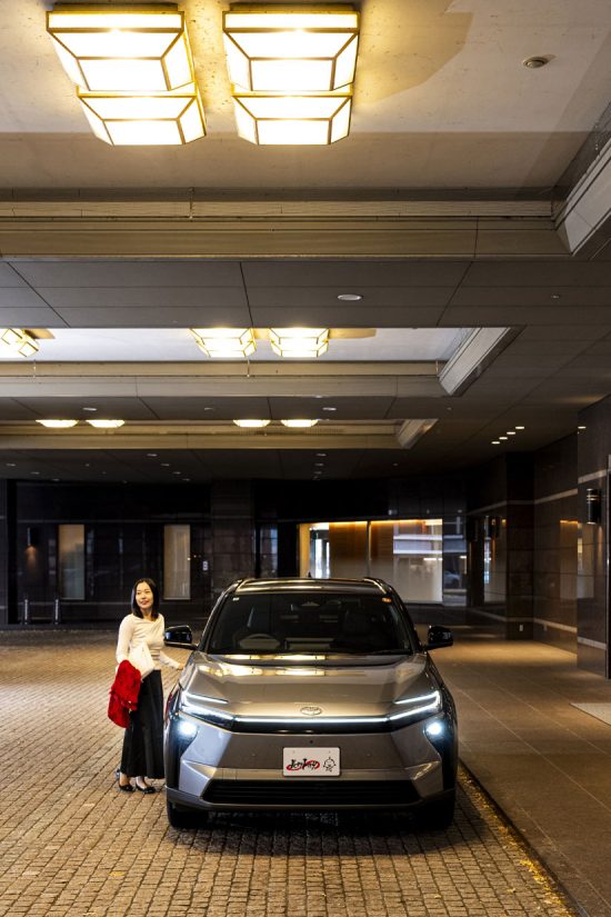 エントランス全体を写し込むことで、落ち着きと安心感のある雰囲気に。暗所の撮影でも照明の光がやさしく回り、重くなりすぎない一枚です。少し低めのアングルから捉えることで、クルマの存在感が自然と際立ち、頼もしさもプラス。横に立つ人物がシーンに日常感を添え、「ちょっと大切な用事で出かける日」を想像させてくれます。