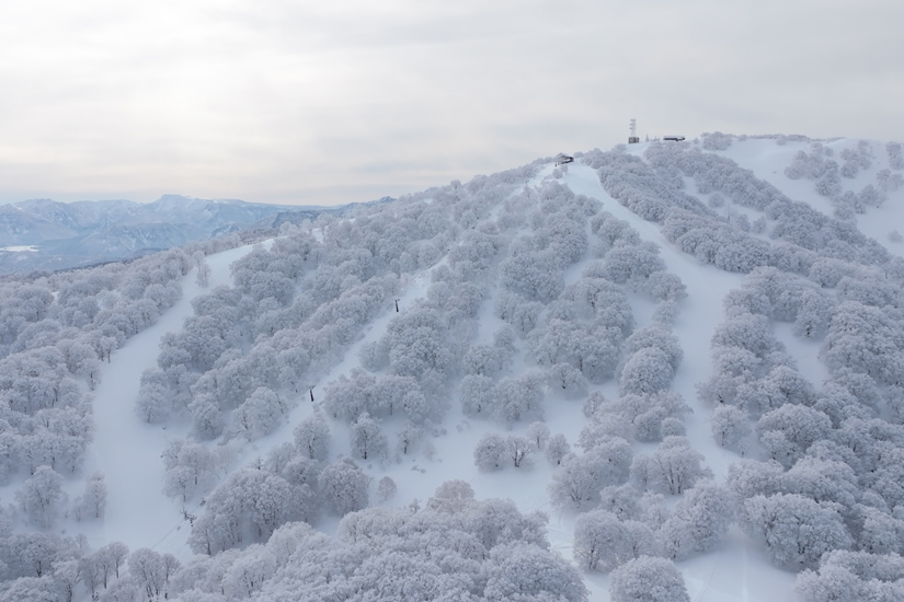 「やまびこゲレンデ」は最大斜度30°で、美しいブナの樹氷に囲まれたパウダースノーの1,300mのコース。スキルアップを目指す方に最適です。
