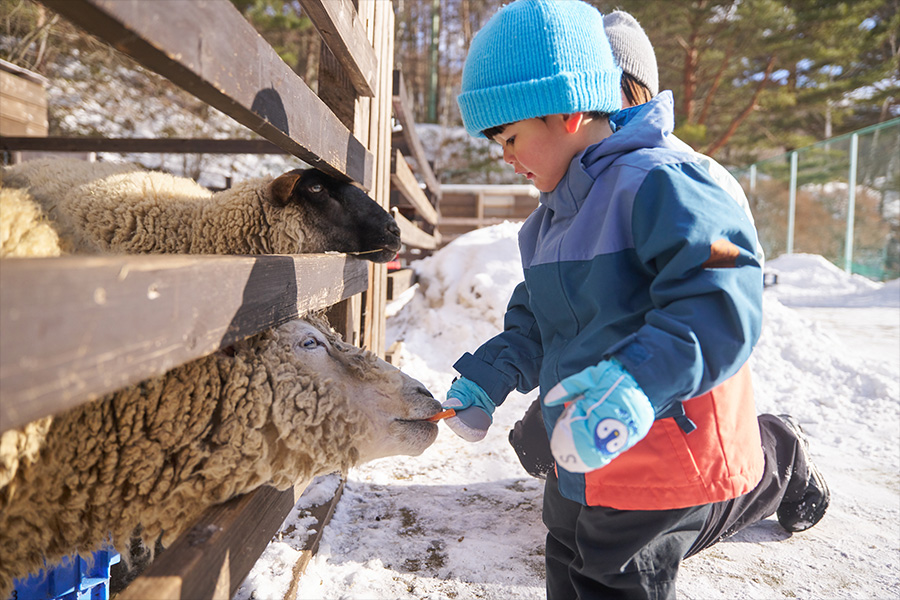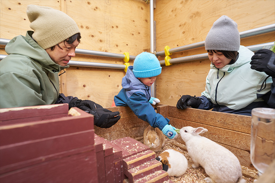 ポニー、ウサギ、モルモット、ヤギ、アルパカ、カピバラなど様々な動物たちと触れ合えるスポットで、雪遊びの合間に動物たちと仲良くなれば、子どもの冬の思い出がさらに豊かになります。