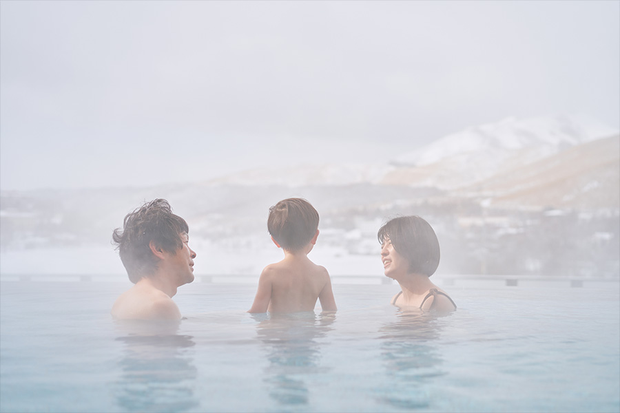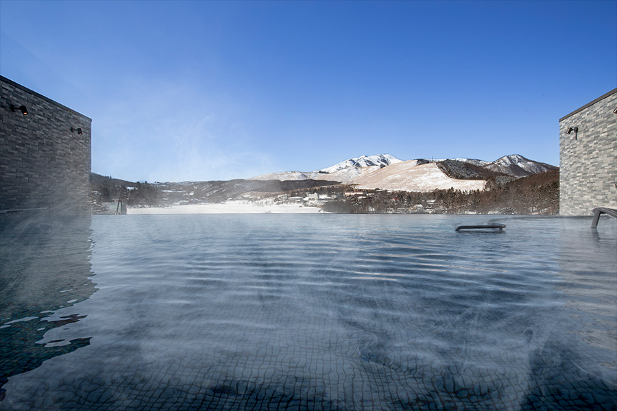 雪遊びやスキーで身体を動かした後は、ホテル内の「天然温泉 湖天の湯」で疲れを癒しましょう。露天風呂からは白銀の白樺湖の絶景が広がります。