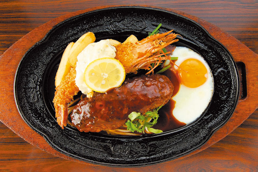 地元で長く愛される洋食屋さん。厚みある俵型のハンバーグは、独自のこね方と絶妙な火加減でふっくらジューシーに仕上げ、自家製デミグラスに秘伝のソースをブレンドした味わいも評判。大ぶりのエビフライとセットの「エビ&ハンバーグ」も人気です。
