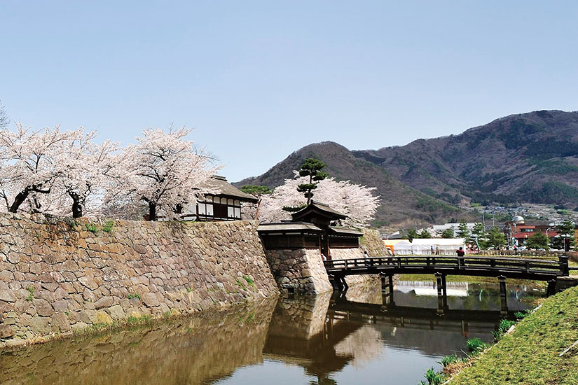 武田信玄が川中島の戦いに備えて築き、江戸時代には真田家が10代にわたり城主を務めたお城の跡。桜の名所としても知られており、4月中旬頃見頃を迎えます。城跡の石垣を囲むように植えられた桜と園内に咲く桜が彩り、例年行われる春まつり期間中は、夜桜ライトアップも行われます。
