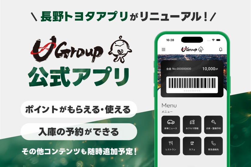 スマホで簡単にカーライフをサポートしてくれる「ユーグループ公式アプリ」がリニューアル。ポイントの取得・利用をはじめ、店舗検索、点検・整備予約、車両整備情報の確認、予約リマインド通知、万が一の際に役立つ緊急連絡先まで、カーライフを支える機能がより充実しました。新しくなったユーグループ公式アプリで、安心・快適なカーライフをはじめてみませんか。