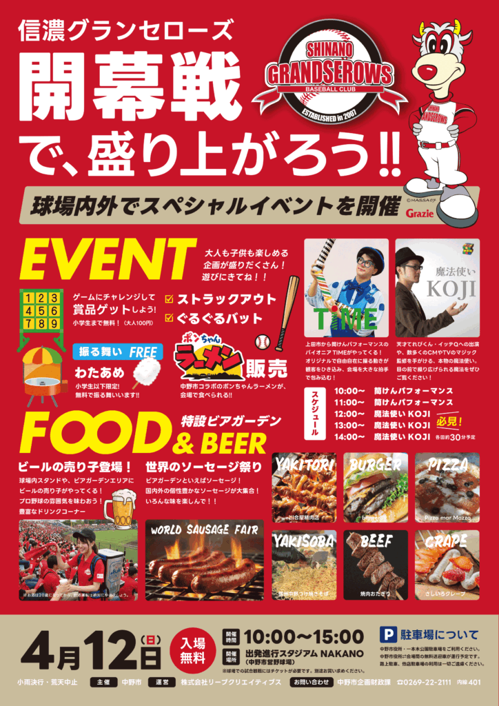 4/12(日) 信濃グランセローズホームゲーム開幕戦(中野市)