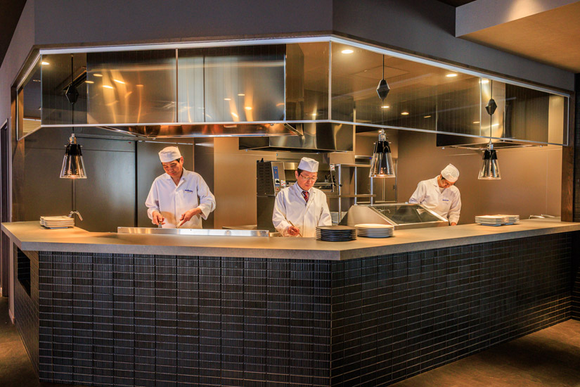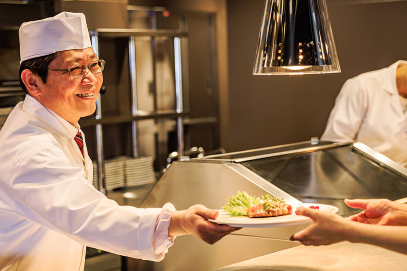 オープンキッチンから焼きたて・揚げたての料理がサーブされるスタイルで、音も香りも臨場感も一緒に味わえます。料理長のこだわりは「和洋中にこだわらず、『うまい』と思えるものを献立に」という一言に集約されており、料理を彩る器へのこだわりも相まって、見た目にも美しい一皿が揃います。