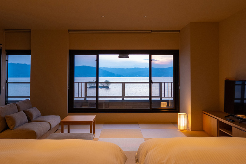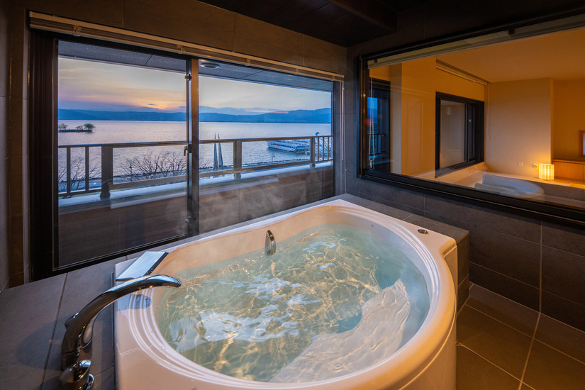 中でも特に人気を集めているのが、諏訪湖を真正面に見ることができる特別室「湖面客室」(湖正面露天風呂[温泉]付きモダン和洋室)です。