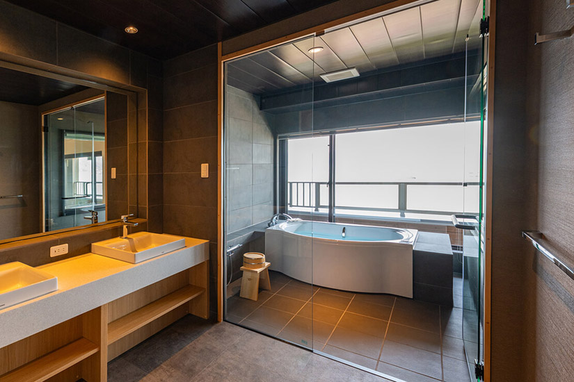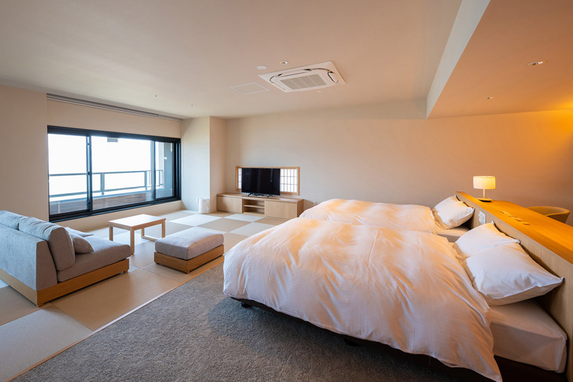 すべて露天風呂付きのモダン和洋室で、畳のぬくもりとベッドの心地よさが見事に調和した空間。開放感あふれる広さと上質な調度品が出迎えてくれます。