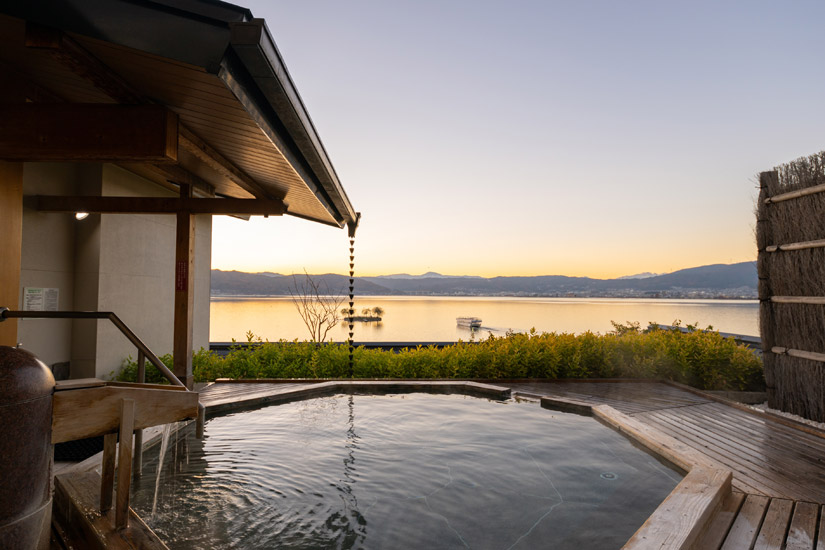 どちらの湯も最上階に設けられた「湖眺の湯」、「峰望の湯」で楽しめ、いずれも露天風呂と大浴場を完備しています。露天風呂に浸かりながら眼下に広がる諏訪湖を眺める時間は、まさにここでしか得られない体験です。